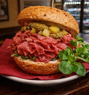 Pane artigianale, maionese alla senape, 150 gr di Pastrami Red Pepper, valeriana fresca e cetrioli sottaceto