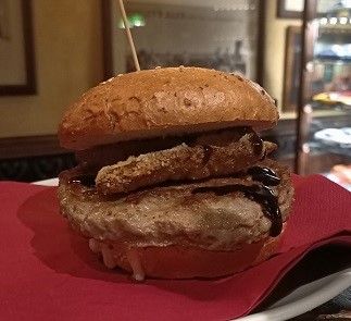 The classic beef burger, browned on the plate and accompanied by salad, tomato, onions, lots of mayonnaise and chips (1-11-3)